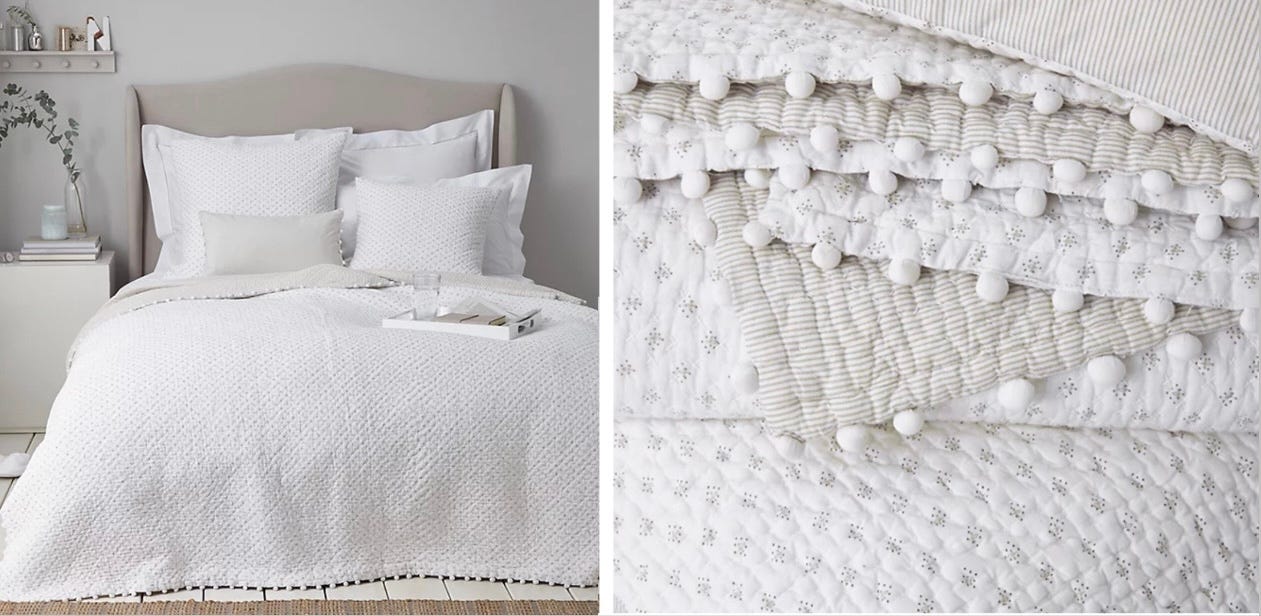 I’ve fallen for the Brittany print from The White Company; it feels so fresh for spring and exactly what I had in mind. And, of course, I love a bobble, so the trim detail was a must. It ties in perfectly with the bobble edging on my bedroom curtains, which makes it feel beautifully pulled together.